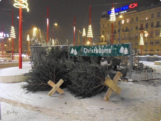 Это елочный базар. Их много по всей Вене. Эти елочки выращены с специальных оранжереях именно на Рождество. Наш гид рассказывал нам историю, как они семьей приобретали свою первую елку в Австрии. Они подумали, что чем ближе к самому празднику, тем елка будет дешевле и удастся выпросить скидку, но сколько они не просили, скидку им никто не дал, потому что продавцам в таком случае выгоднее отправить елочку на переработку. Они в любом случае не теряют в деньгах. На наше счастье, в день нашего приезда пошел снег, что для жителей Вены целое событие. Ну а нам удалось почувствовать тот самый дух Рождества.
